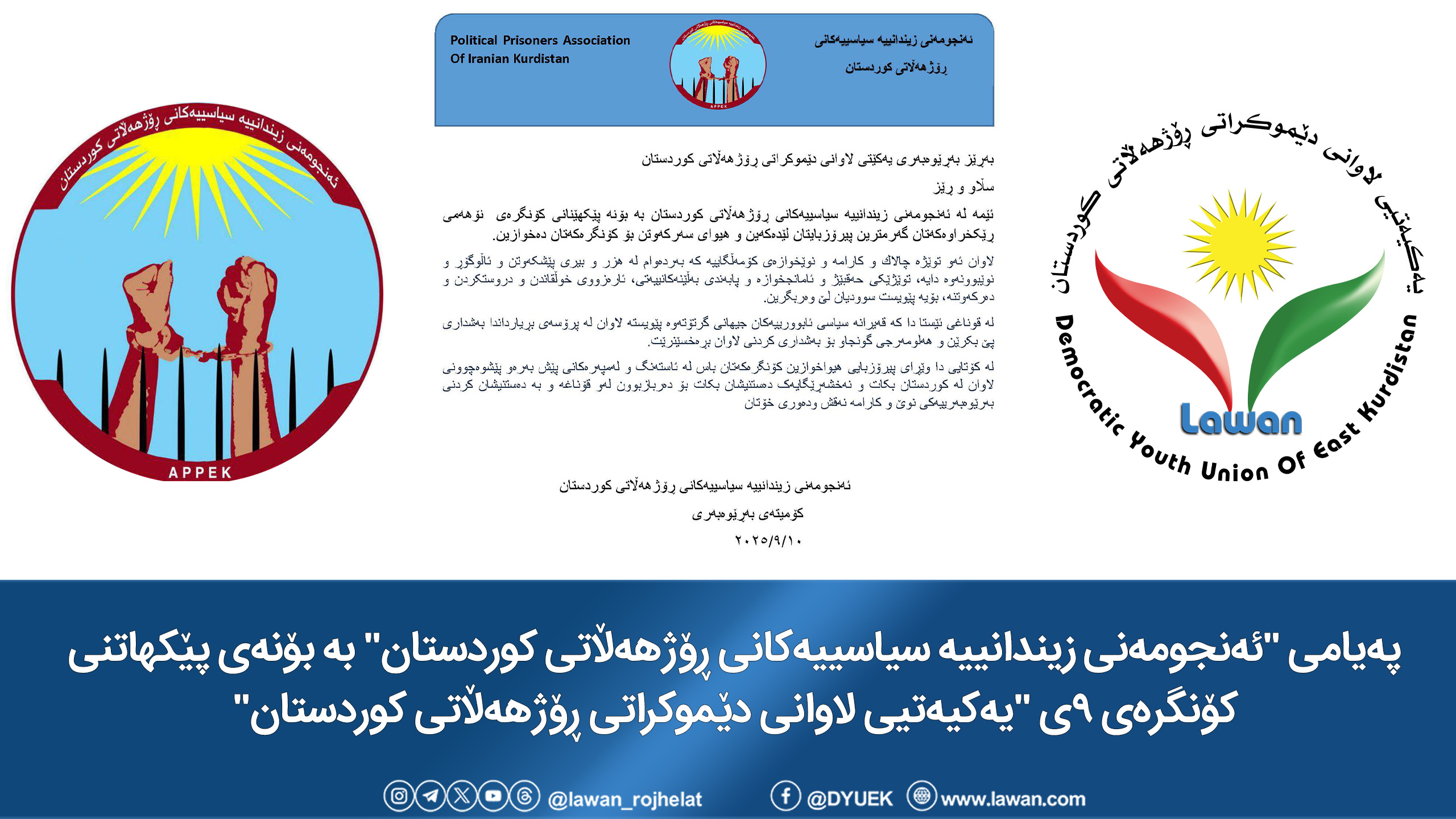 ئێمە لە ئەنجومەنی زیندانییە سیاسییەکانی ڕۆژهەڵاتی کوردستان بە بۆنە پێکهێنانی کۆنگرەی نۆهەمی ڕێکخراوەکەتان گەرمترین پیرۆزبایتان لێدەکەین و هیوای سەرکەوتن بۆ کۆنگرەکەتان دەخوازین.